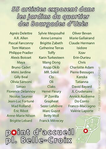 Le quartier des Bourgades, extension du centre historique, est rassemblé autour de ses deux rues principales : la petite et la grande Bourgade. Ces jardins seront l'écrin des œuvres de peintres, des dessinateurs, illustrateurs, grapheurs, photographes, sculpteur et céramistes. Une façon unique de découvrir l'envers du décor, une promenade artistique mettant en alerte tous les sens, odorat, vue, ouïe... Une parenthèse enchantée. A la fin de la balade le public désignera par vote, l'artiste de son choix comme lauréat. D'autres prix seront également décernés : Le prix du Jury, le prix de l'association communales d'Uzès, le prix de 'Atelier d'Anne et le prix de l'Echoppe des artistes.