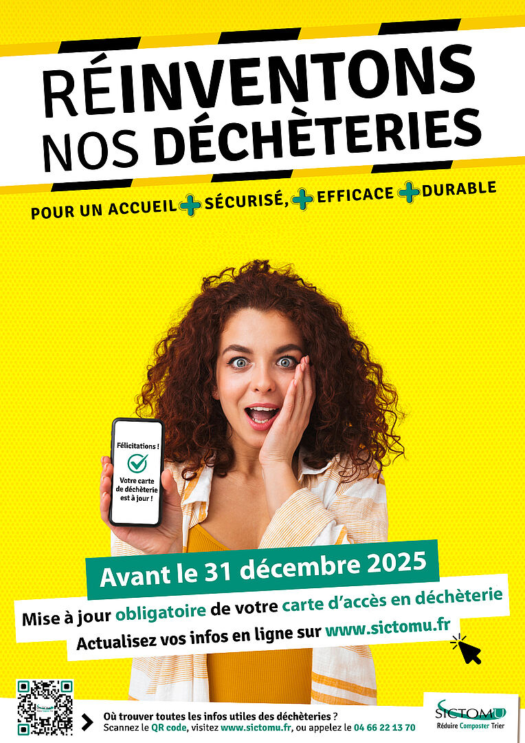 Le SICTOMU modernise le système de contrôle d’accès aux déchèteries. Pour celle d'Uzès, il faudra avoir mis à jour vos informations (numéro de carte d’accès et numéro de bac à ordures ménagères) avant le 31 décembre 2025 pour pouvoir continuer à accéder à la déchèterie.
