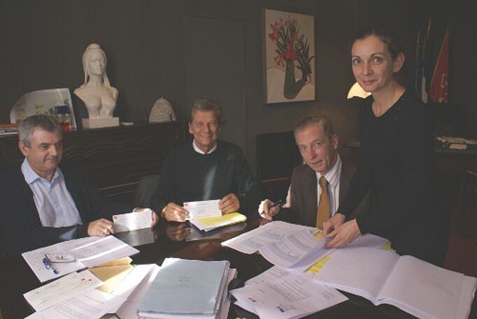 De gauche à droite : Michel Galtier, trésorier principal, Jean-Luc Chapon, maire d'Uzès, Didier Gimeno, responsable développement de la région Sud-Est de la société nationale immobilière, SNI et Marie-Pierre Ferrand, étude notariale parisienne.