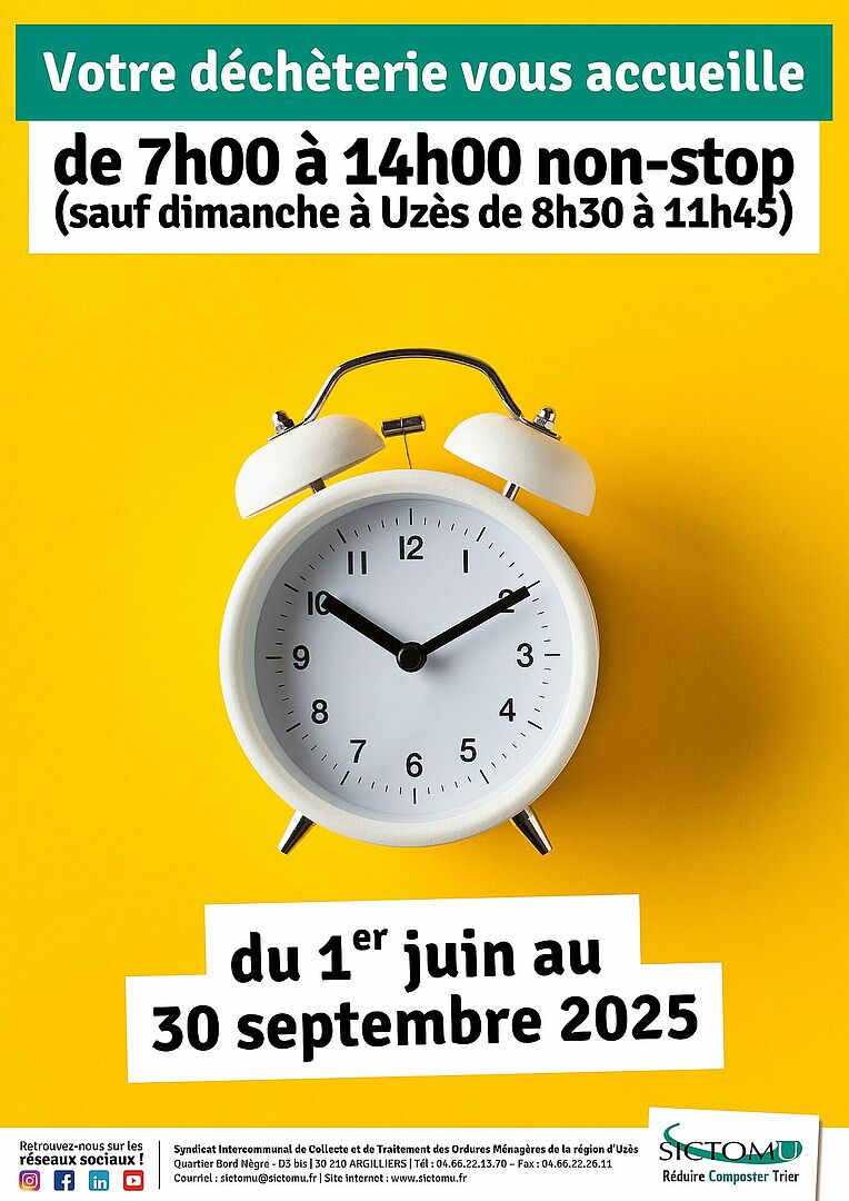 Depuis le 1er juin et jusqu’au 30 septembre 2025, les déchèteries du territoire passent à l’heure d’été ! Les déchèteries de Uzès, Lussan et Vallabrix seront ouverts en continu de 7h à 14h, aux jours habituels d’ouverture, afin de mieux s’adapter aux températures estivales et de garantir plus de confort aux usagers comme aux agents.