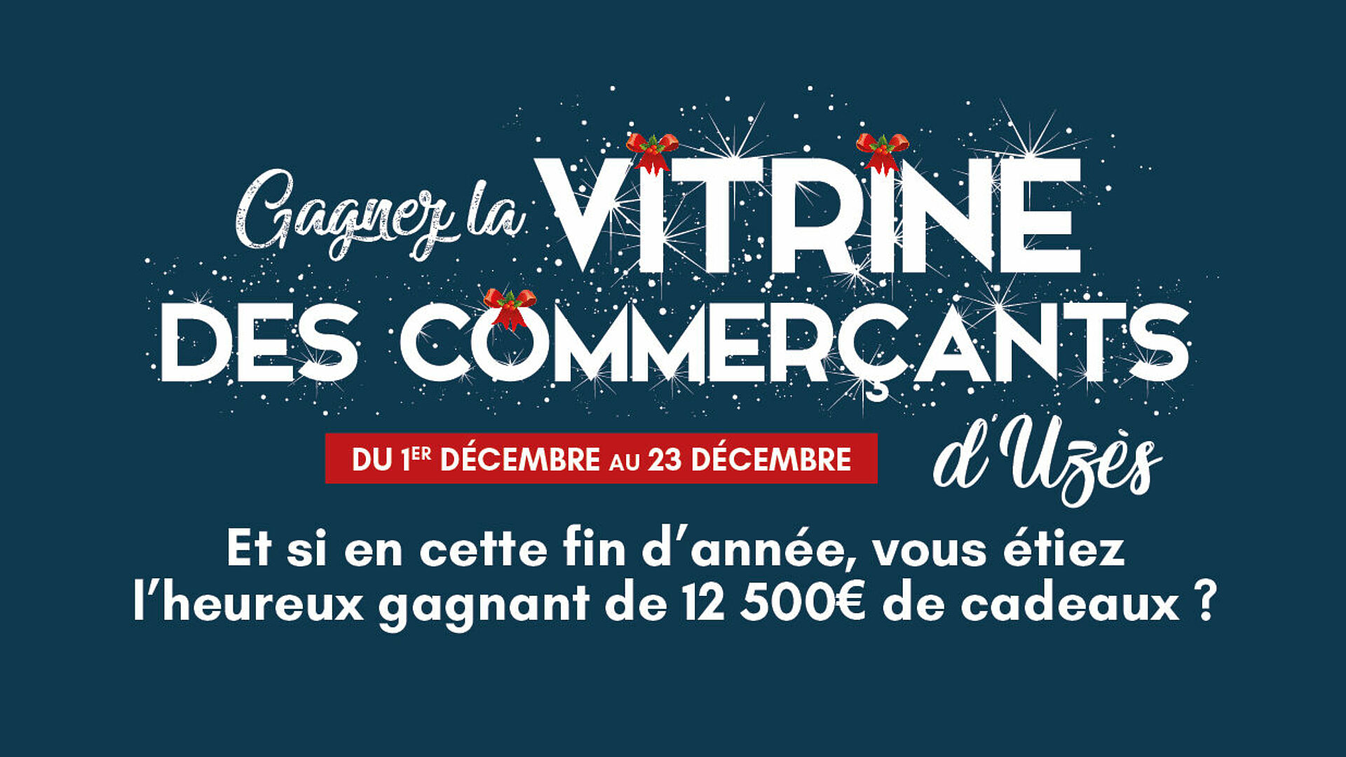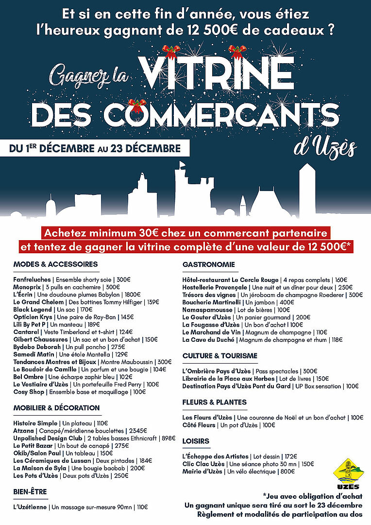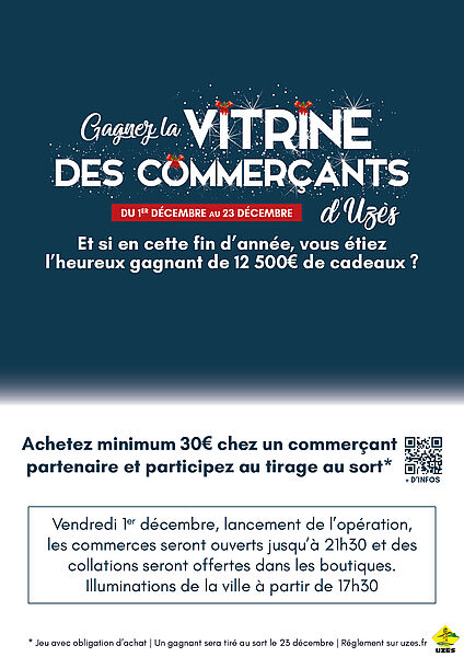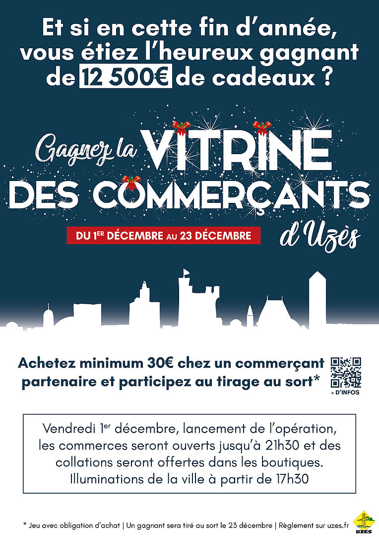 C'est la grande nouveauté de cette fin d'année 2023. La ville d'Uzès organise un jeu-concours exceptionnel (avec obligation d'achat) du 1er décembre au 23 décembre 2023 vous permettant de remporter 12 500€ de cadeaux. Une opération qui vise à dynamiser le centre-ville et à augmenter la fréquentation des commerces uzétiens durant les fêtes. Un unique gagnant sera tiré au sort et remportera l'ensemble de la vitrine à 12 500 €.