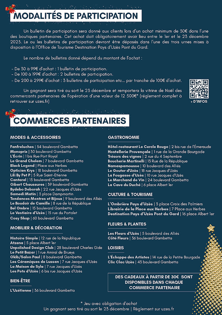 Un bulletin de participation sera donné aux clients lors d’un achat minimum de 30€ dans l’une des boutiques partenaires. Cet achat doit obligatoirement avoir lieu entre le 1er et le 23 deécembre 2023. Le ou les bulletins de participation devront être déposés dans l’une des trois urnes mises à disposition à l’Office de Tourisme Destination Pays d’Uzès Pont du Gard.