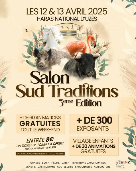Les 12 et 13 avril 2025, le Haras National d’Uzès accueillera la 3ᵉ édition du Salon Sud Traditions, un événement dédié aux traditions et à l’art de vivre du Sud de la France. Ce rendez-vous incontournable rassemble passionnés de chasse, de pêche, d’élevage, de gastronomie et de culture camarguaise dans un cadre authentique et festif.