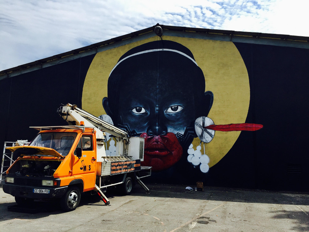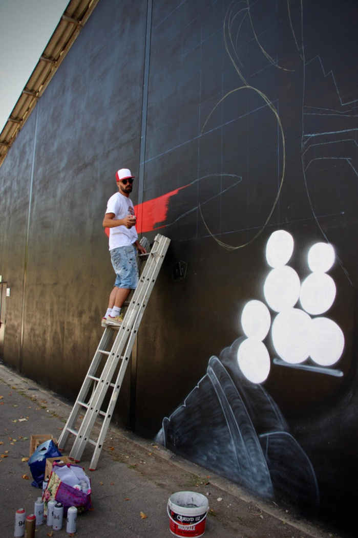 Le fond a donc été réalisé au pistolet sur la paroi du gymnase du stade Pautex, et l'enfant a pris forme grâce à l'aérographe. Pour peindre le mur dans sa totalité, le graffeur n'a eu d'autre choix que d'utiliser une nacelle et ainsi prendre de la hauteur.