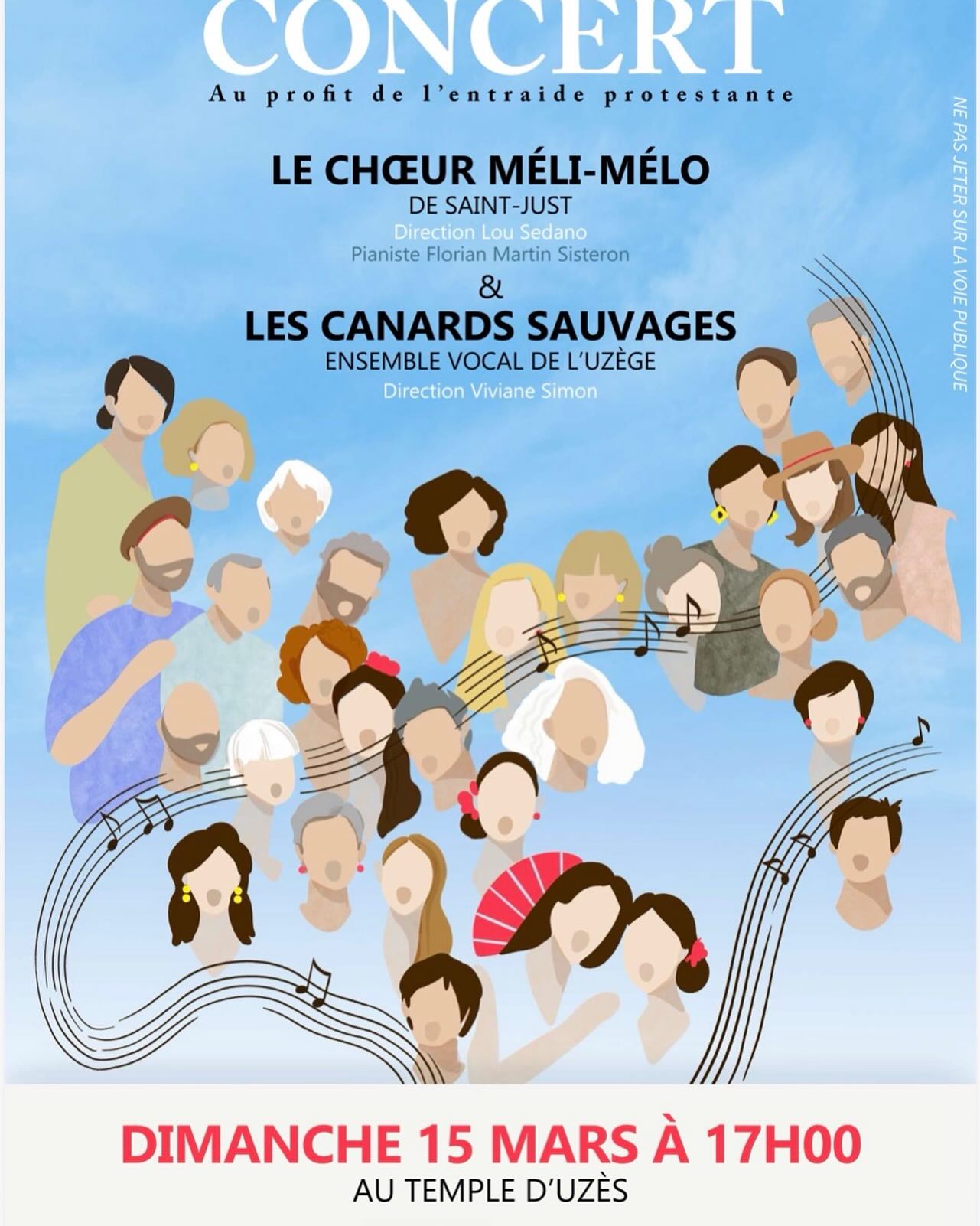 Les Canards Sauvages ont le plaisir d’inviter le Chœur Méli-Mélo de Saint-Just. Pour cet événement exceptionnel, une programmation axée sur la diversité des styles musicaux allant des œuvres classiques, du jazz, des chants traditionnels, des chants du monde et de la polyphonie vous sera proposée. Une occasion unique à travers un concert commun de célébrer la solidarité et le partage en vous laissant porter par l’énergie et la passion du chant.