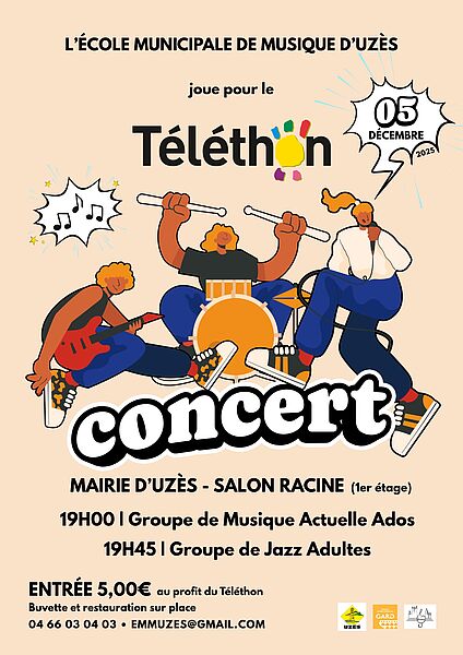 Le05déc.hourDu 19:00 - 20:15 Lieu Mairie d'Uzès, 1 place du Duché 30700 UzèsConcertConcert pour le TéléthonÀ l'occasion du Téléthon, les groupes de Musique Actuelle Ados et de Jazz Adultes de l'École Municipale de Musique d'Uzès, donnent un concert. Venez nombreux et participer à aider la recherche contre les maladies génétiques !Tarif(s) : Plein tarif : 5 € (Au profit du Téléthon.).Ajouter à mon calendrierÉcole de musique d'Uzès19H00 | Groupe de Musique Actuelle Ados 19H45 | Groupe de Jazz AdultesSélection de la vue© OpenStreetMap contributorsFermerPrécédentRetour à la listeSuivant