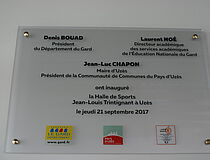 Un nouvel équipement sportif, une halle des sports Jean-Louis Trintignant à Uzès vient d'être inaugurée par les autorités territoriales du Département, de la Ville d'Uzès et de la Communauté de communes Pays d'Uzès, le représentant du Rectorat de Montpellier et la principale du collège au quartier Mayac, ce jeudi 21 septembre 2017. Ce complexe sportif est destiné aux élèves du collège, mais aussi aux associations locales hors temps scolaire.