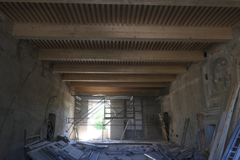 Après neuf mois de restauration, l’ancien évêché s’offre une seconde jeunesse grâce à la réfection complète de la toiture et la restitution du plafond effondré du grand salon au premier étage. La rénovation est désormais presque achevée, le bâtiment est hors d’eau et hors d’air.