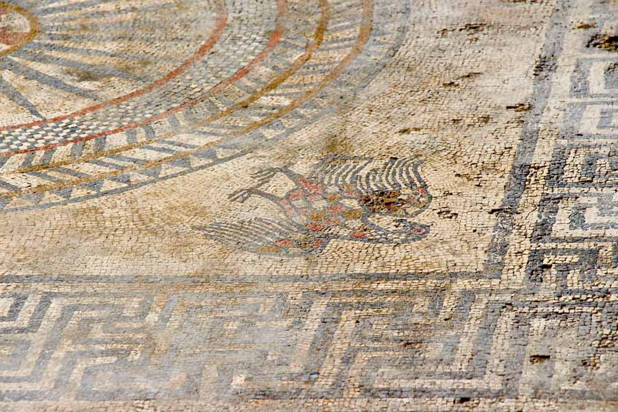 A une extrémité de l'édifice se trouve une pièce avec un sol de mortier incrusté de tesselles, cubes en croisettes, monochromes, rouge, noir et blanc. Elle donne accès à une salle spacieuse de 60 mètres carré. "Le sol est décoré d'un pavement mosaïqué complexe. Deux vastes mosaïques sont ornées de motifs géométriques qui encadrent deux médaillons centraux formés de couronnes, de rayons et de chevrons".