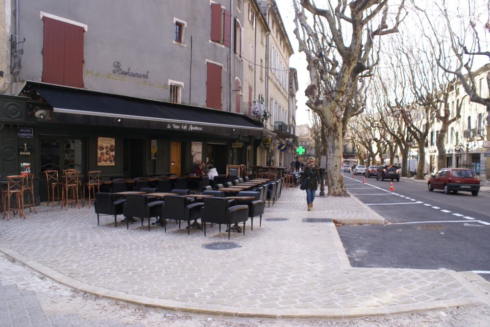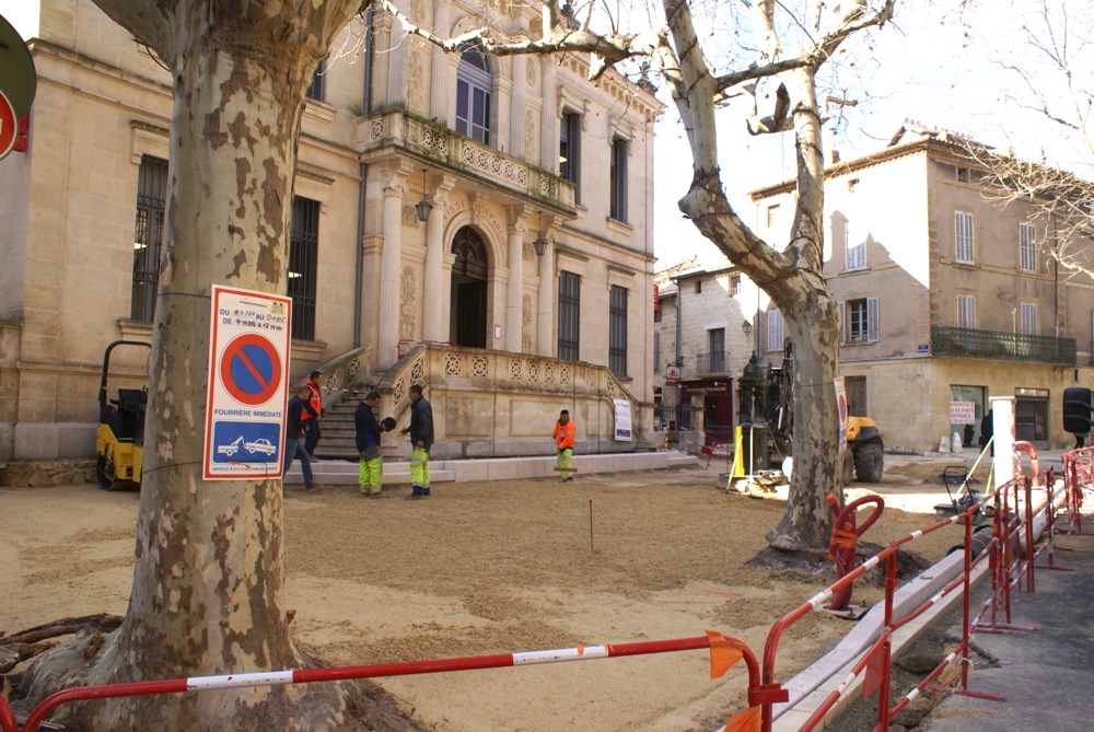 La troisième et dernière tranche a débuté le 7 janvier par la démolition de l'ancien revêtement de la place Belle Croix, suivie par la place Albert 1er, en démarrant par la réfection des réseaux enterrés sur les conduites d'eaux par l'entreprise Carminati. Devant la mairie, le 4 février, les interventions se poursuivent. Se sont ajoutés deux chantiers supplémentaires sur une partie des rues Jacques d'Uzès et Benoît où seul le revêtement était initialement concerné. Trois bornes rétractables seront installées rues Xavier Sigalon, Grande Bourgade et St Etienne.